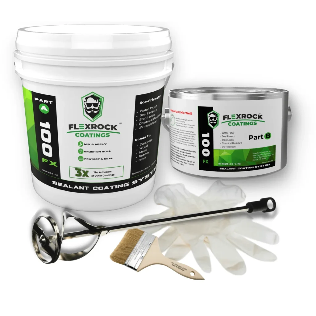 One FlexRock 5-Gal Kit Covers Aprox 150-250 Sq ft of flat smooth surfaces. We recommend a minimum of 32 mills of coverage. Sq. Ft/Kit 32 ml @ 250 ft.².