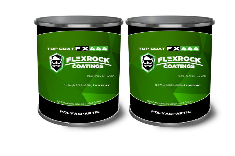 FlexRock FX-444 is a two component high solids polyaspartic clear topcoat with excellent chemical resistance, UV stability, abrasion resistance and hardness. This material is intended to be used as a high gloss topcoat over paint chips, decorative broadcasts or colored quartz broadcasts to provide an infinite array of color schemes or patterns. Pigment can also be mixed in with topcoat before application. Â